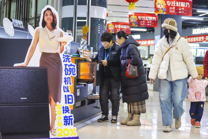 2025年1月8日,顧客在山東省青島市李滄區李村街道一家商場選購洗碗機。新華社發(張鷹 攝)