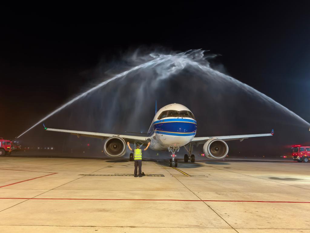 6月4日晚,中國南方航空CZ3383航班順利抵達南陽姜營機場,國產大飛機C919完成支線機場商業首航。新華社發(陳陽攝)