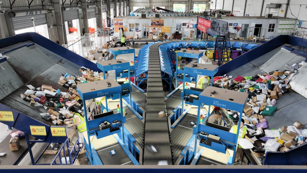 2025年6月18日,在重慶市秀山土家族苗族自治縣武陵現代物流園區快遞分撥中心,工作人員在智能快遞分揀流水線上作業(無人機照片)。(胡程 攝)