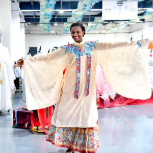 6月19日,在曹縣有愛云倉漢服基地,中華女子學院非洲法語國家婦女能力建設研修班的學員在體驗漢服。