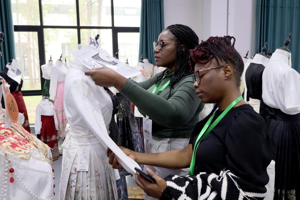 6月19日,在曹縣有愛云倉漢服基地,中華女子學院非洲法語國家婦女能力建設研修班的學員在挑選漢服。