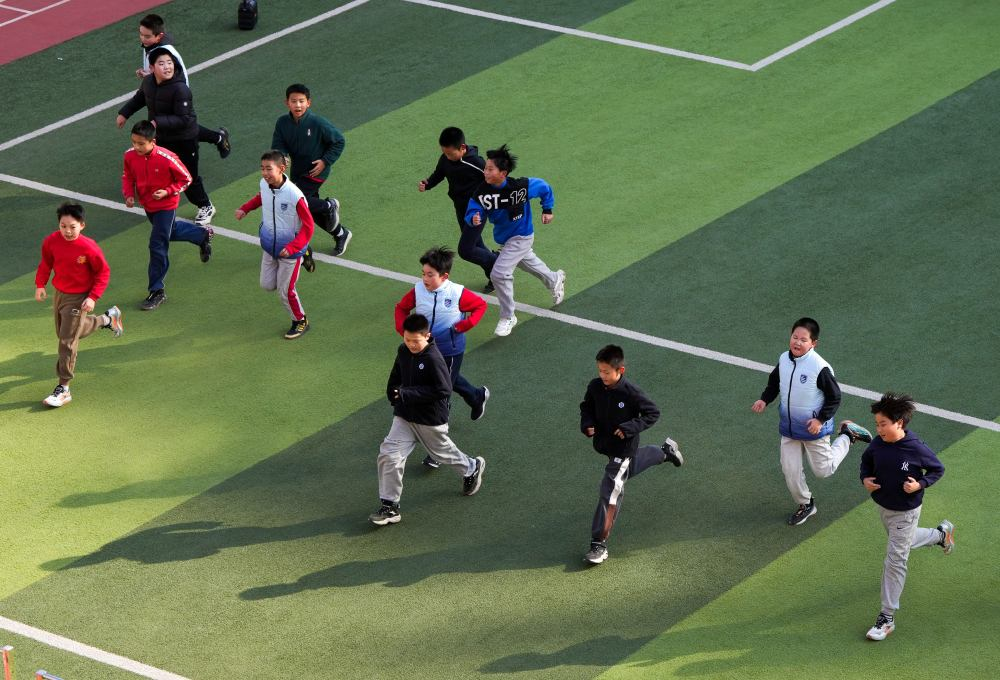 2月21日,北京市宣武師范學校附屬第一小學,學生在體育課上跑步熱身。新華社記者 鞠煥宗 攝