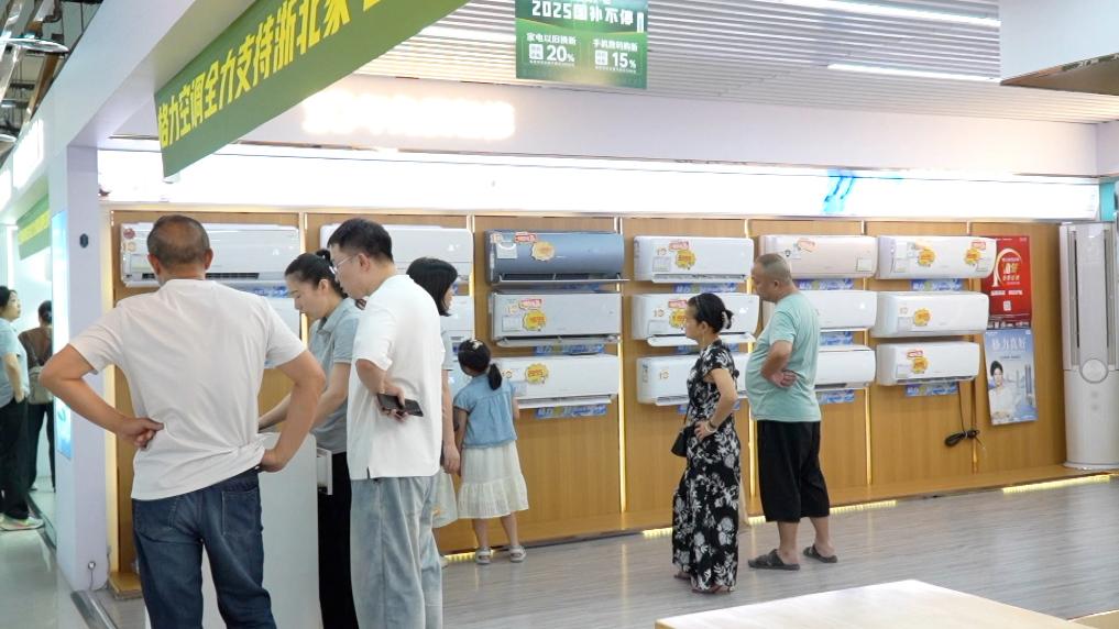 位于浙江湖州的浙北家電正在舉辦空調節和數碼節,政府補貼和店內補貼的各類標語隨處可見,吸引了許多消費者前來。