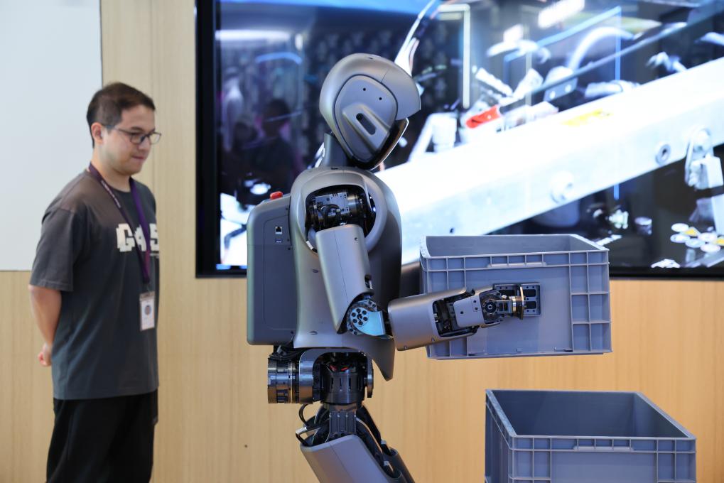4月23日,在深圳優必選科技展廳內,工業人形機器人Walker S演示搬運物品。 新華社記者 梁旭 攝