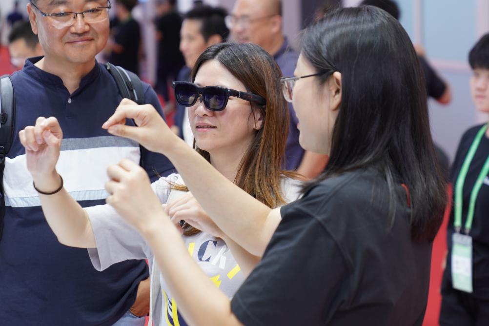 7月16日,在第三屆中國國際供應鏈促進博覽會上,參觀者體驗一款智能眼鏡。 新華社記者 戴明軒 攝