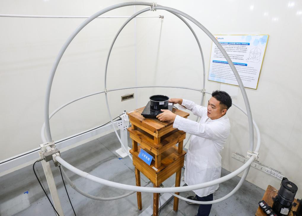 技術人員在新寶股份認證測試中心運用三環天線測量電磁爐磁場感應電流(7月24日攝)。