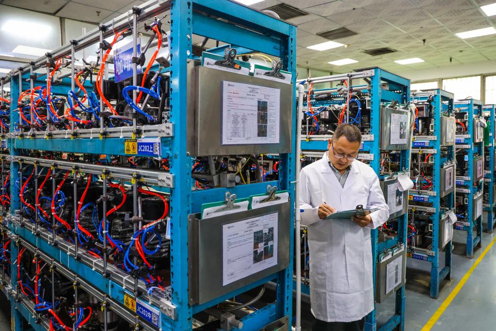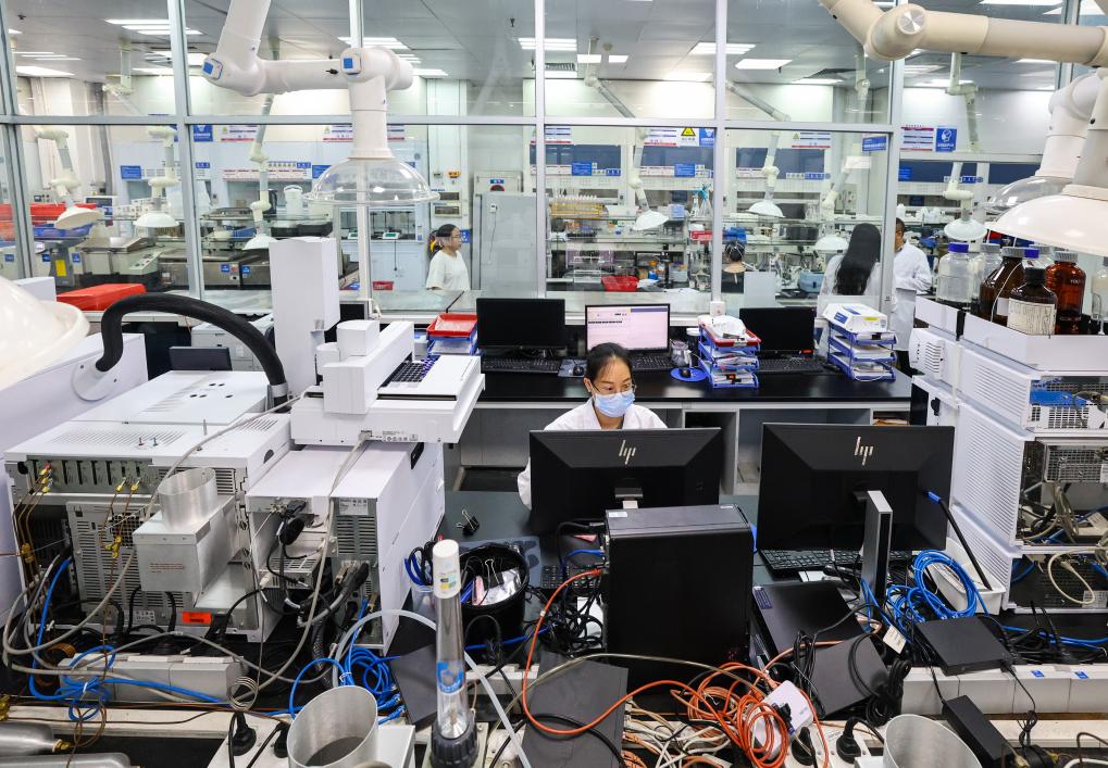技術人員在新寶股份認證測試中心進行理化測試(7月24日攝)。