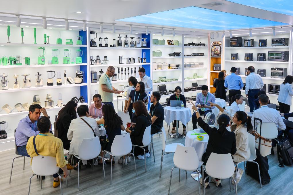 在第137屆廣交會上,新寶股份展區的全類目電器產品吸引眾多采購商洽談采購(4月15日攝)。