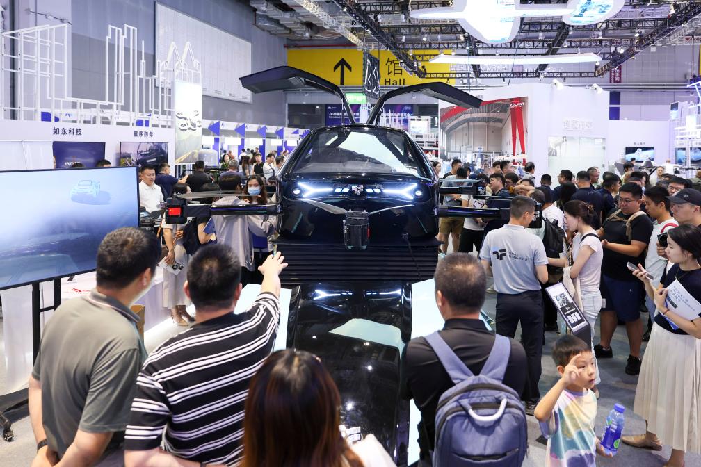 7月23日,觀眾在博覽會現場了解一款飛行汽車。新華社記者王翔 攝