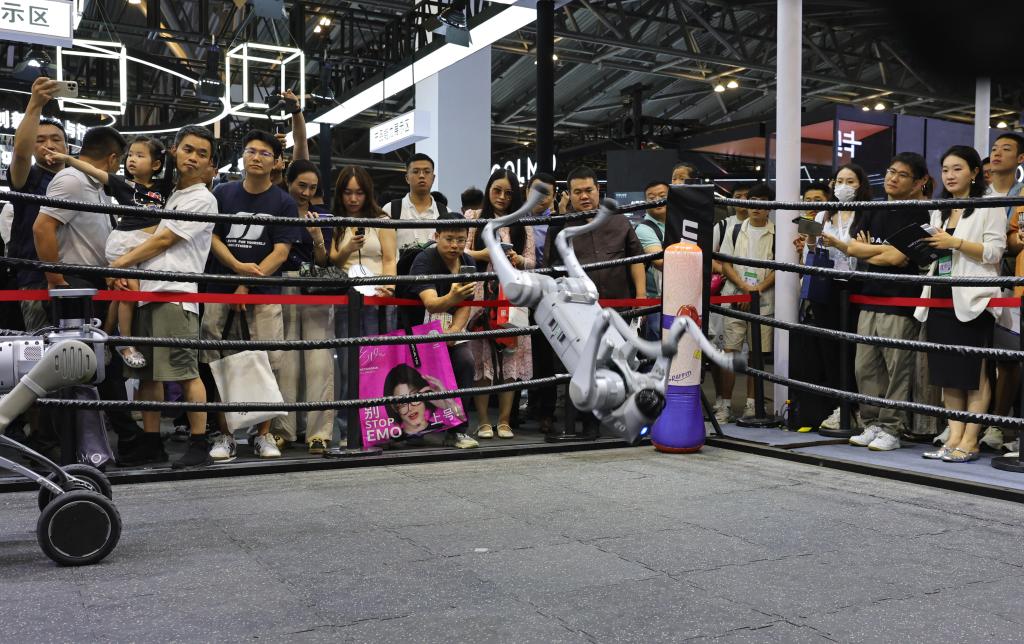 在宇樹科技展位,兩臺身高1.32米、重35公斤的宇樹科技G1格斗機器人上演格斗賽,直拳、躲閃、回旋踢,機器人頗有職業格斗運動員的風采。