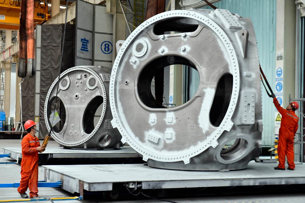 在位于山東省濱州市惠民縣的山東國創精密機械有限公司,工作人員在對風電輪轂進行噴涂作業。新華社記者郭緒雷 攝