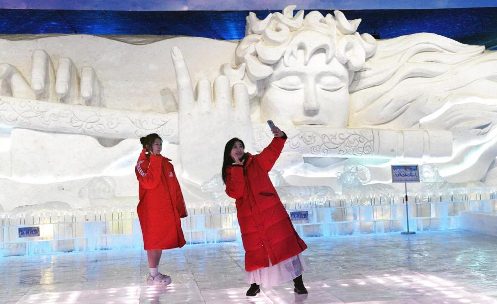 7月9日,在哈爾濱太陽島冰雪藝術館,游客在雪雕作品前留影。新華社發(劉洋攝)