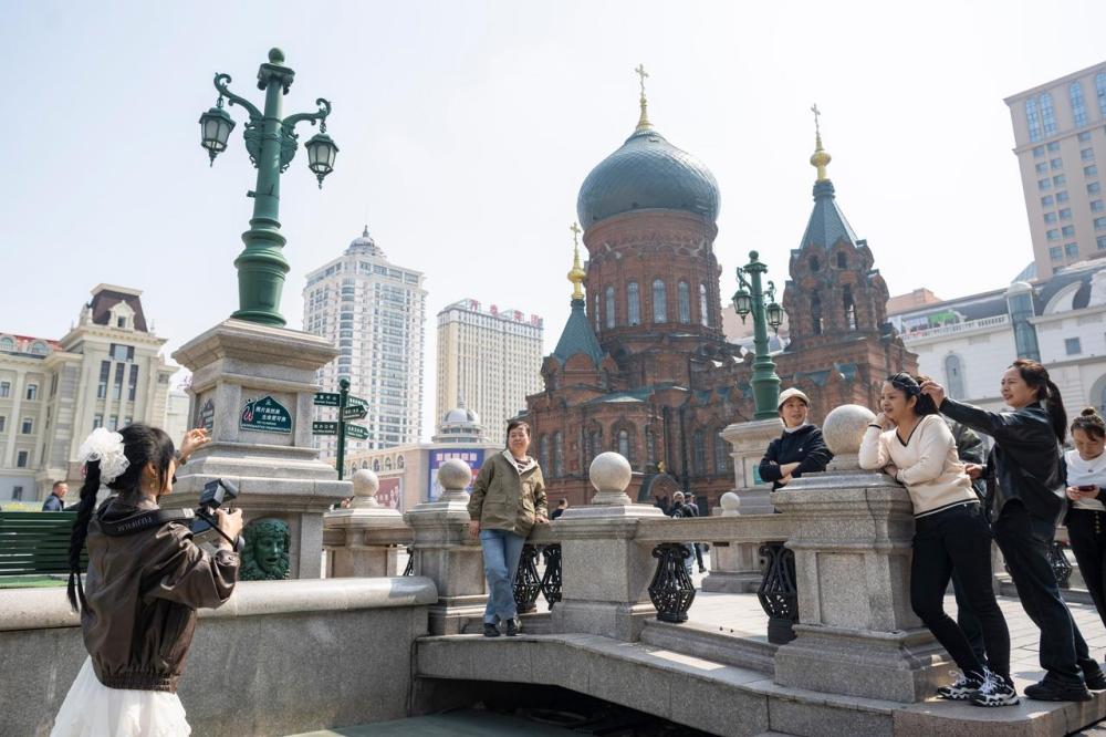 游客在哈爾濱市地標建筑索菲亞教堂附近游玩(2025年4月8日攝)。新華社記者謝劍飛攝
