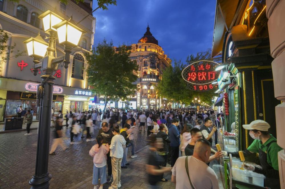 人們在哈爾濱中央大街游玩、購物(2025年6月8日攝)。新華社記者王建威攝