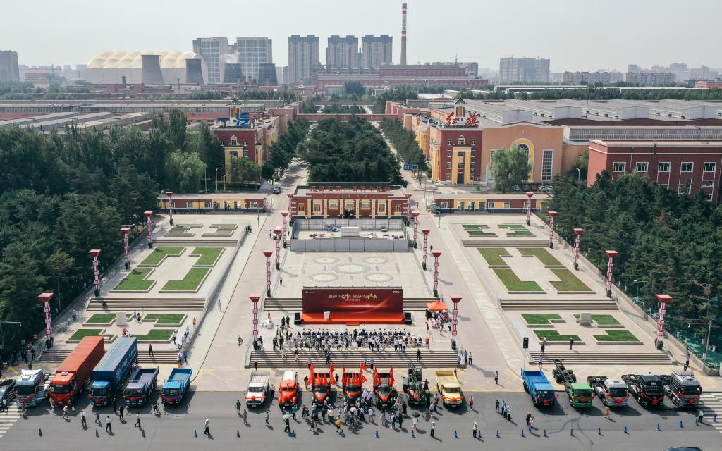 一汽解放卡車在中國第一汽車集團有限公司廠區一號門前進行集中展示(無人機照片)。新華社記者 許暢 攝