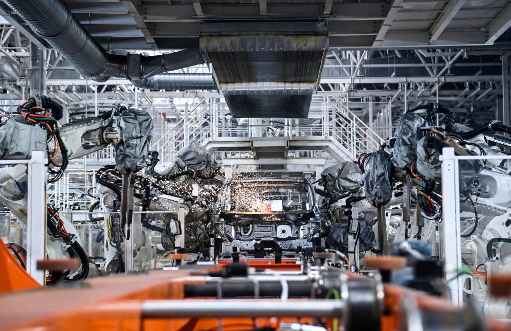 在吉林長春中國第一汽車集團有限公司紅旗繁榮工廠焊裝車間內,焊裝機器人在生產線上焊接車身。新華社記者 顏麟蘊 攝