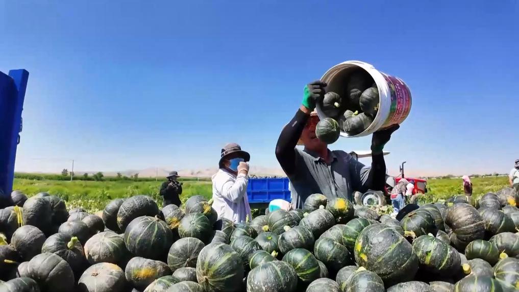 當前,寧夏各地的特色農作物迎來采收旺季。在中寧縣喊叫水鄉,4000畝的南瓜正在緊張采摘之中。