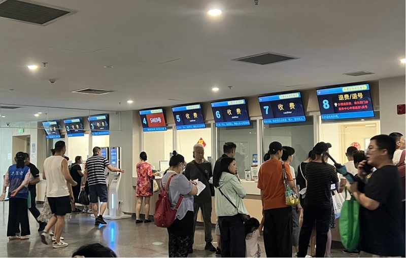 8月8日上午10點,北京某三甲醫院內,陪診師黃媛(化名 圖片正中)正在幫助患者辦理退費手續。 新華網 邐琛 攝