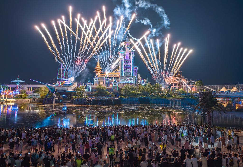7月19日,在湖北省襄陽市華僑城奇幻谷,游客觀看大型夜間演藝秀《奇幻城堡光影秀》(無人機照片)。新華社發(楊東 攝)