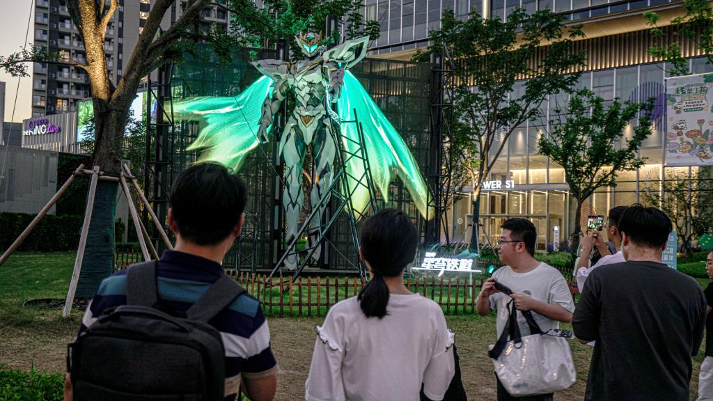 上海市“元界NeoWorld”元宇宙街區內,游戲《崩壞:星穹鐵道》的巨型薩姆機甲吸引眾多游客打卡拍照。王思逸 攝