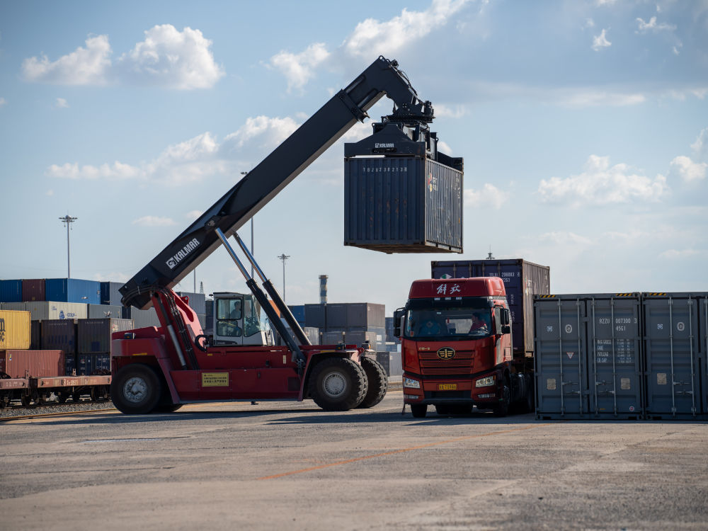 2025年7月14日,長春興隆鐵路口岸作業區內的吊裝車將集裝箱裝載到卡車上。新華社記者 邵澤東 攝