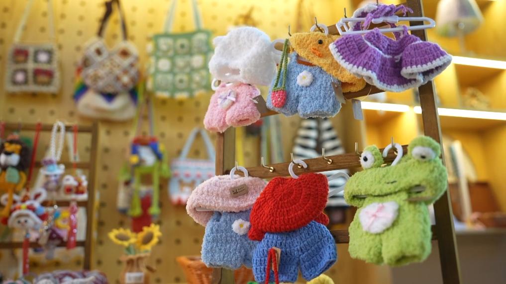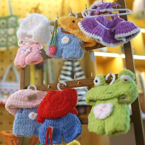 這些“娃衣”出自桐鄉市一家已經開了20多年的老牌服裝廠,走進廠區二樓的“多巴胺毛線屋”,各種毛線玩偶、包包琳瑯滿目,“娃衣”更是款式各異,背帶褲、上衣、裙子應有盡有。