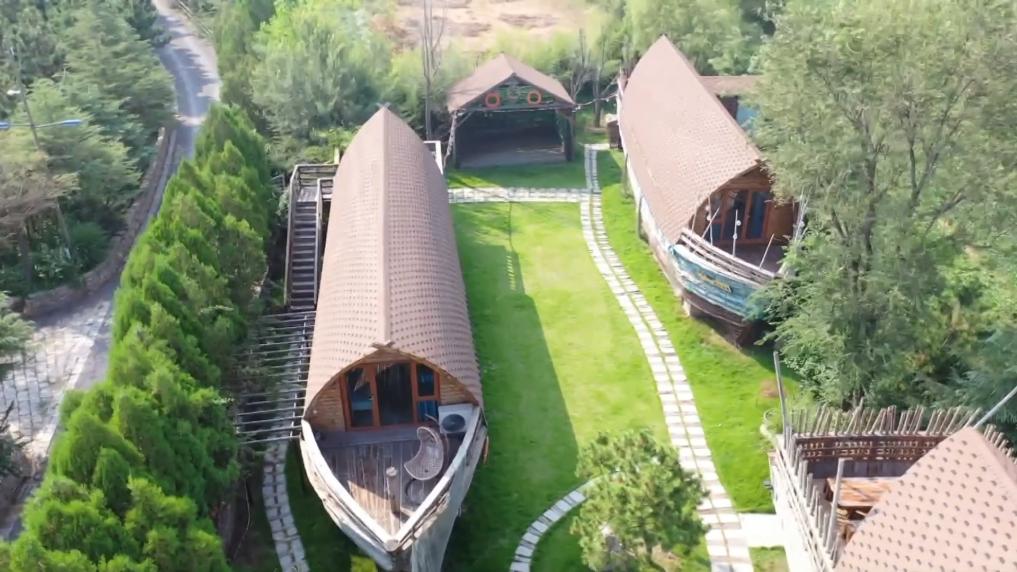 在日照山海天旅游度假區,有一個充滿海洋元素的園區。50多艘木殼老漁船被搬上岸,改造成船塢民宿。漁具老物件與現代創意結合,讓老船有了新生命。