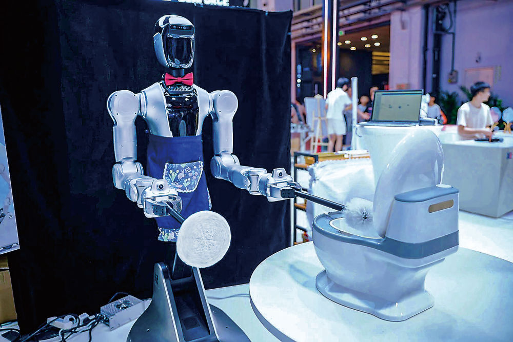 裝配夾爪的“量子2號”機器人,在2025世界機器人大會展臺演示使用清潔工具進行360度無死角全方位清潔。受訪者供圖