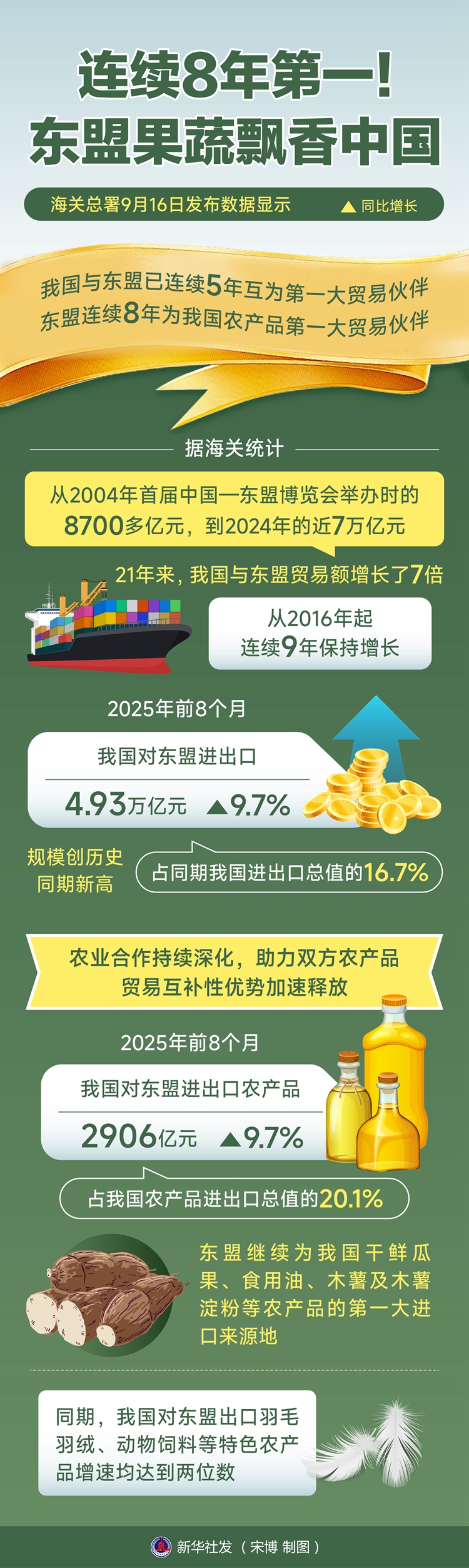 新華社北京9月16日電(記者鄒多為)海關總署16日發布數據顯示,我國與東盟已連續5年互為第一大貿易伙伴,東盟連續8年為我國農產品第一大貿易伙伴。