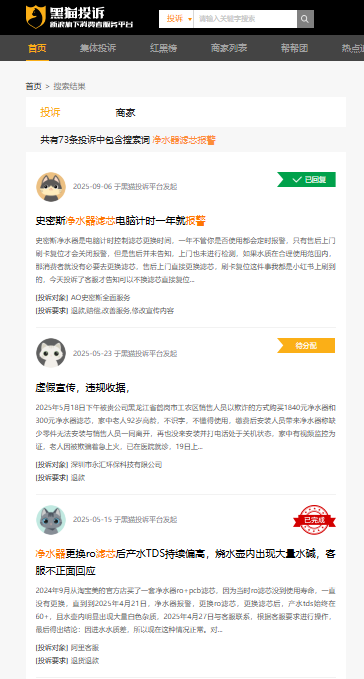 在黑貓投訴平臺,對凈水器濾芯的投訴不在少數,多集中于“使用頻率不高卻頻繁提示更換”“售后未檢測直接建議換濾芯”等問題。