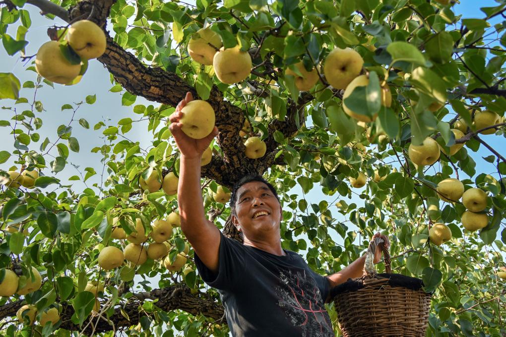 9月15日,在安徽省宿州市碭山縣一處梨園內,梨農在采摘酥梨。新華社發(崔猛 攝)