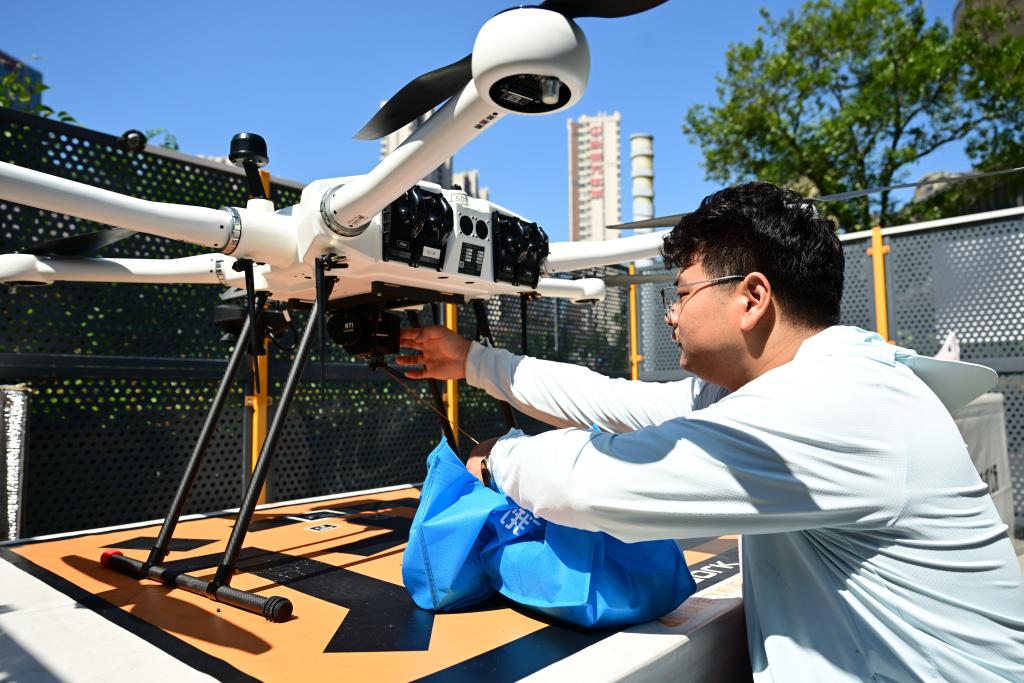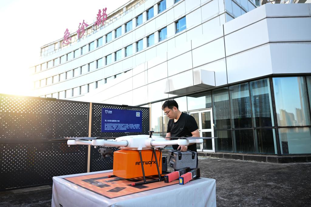 8月15日,在合肥市包河區一個無人機起降場,工作人員將準備運送的外賣掛到無人機下方。新華社記者 周牧 攝
