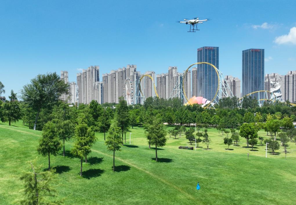 8月15日,在合肥市包河區,一架無人機在運送外賣(無人機照片)。新華社記者 周牧 攝