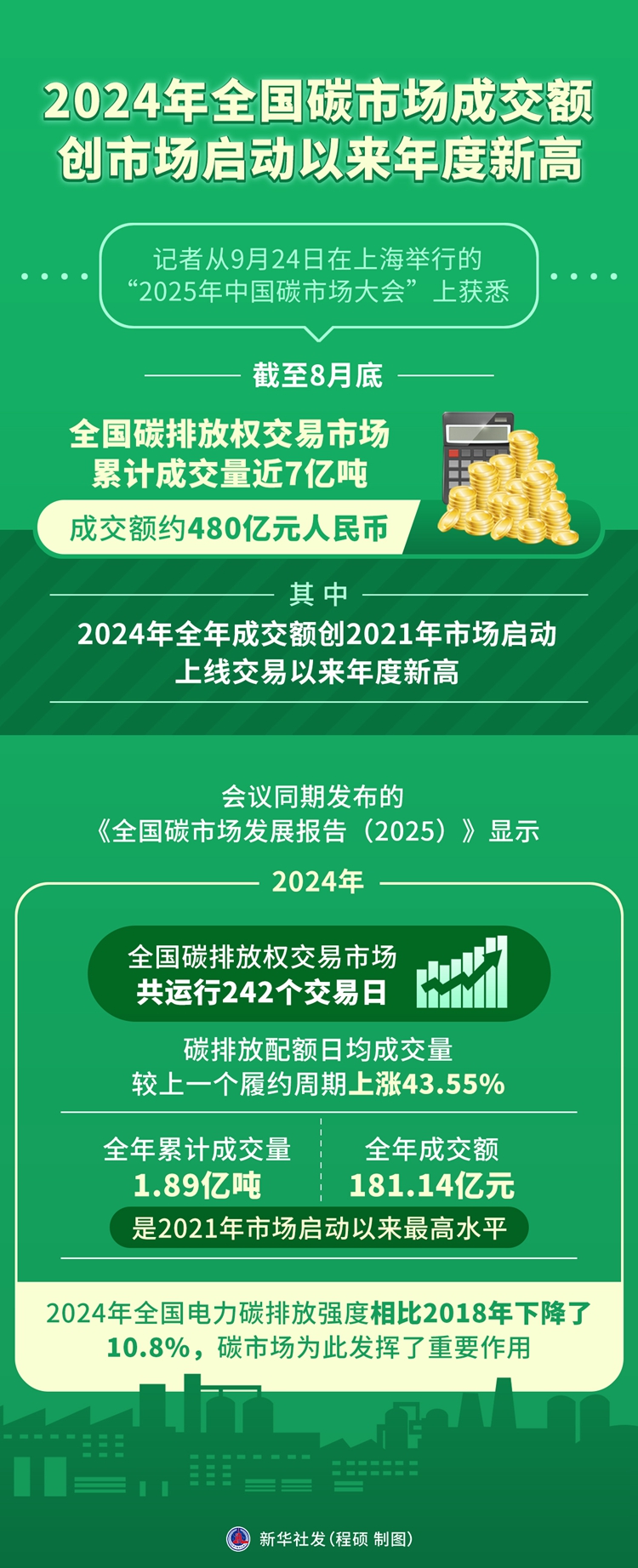新華社上海9月24日電(記者王默玲、高敬)記者從24日在上海舉行的“2025年中國碳市場大會”上獲悉,截至8月底,全國碳排放權交易市場累計成交量近7億噸,成交額約480億元人民幣。其中,2024年全年成交額創2021年市場啟動上線交易以來年度新高。