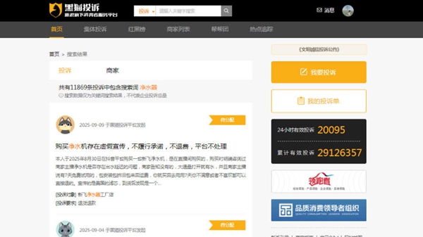 然而,在市場繁榮的背后,行業亂象也逐漸浮出水面。記者在黑貓投訴平臺上查詢到,關于凈水器的投訴量高達11869條。消費者投訴內容主要集中在濾芯使用壽命標注模糊、功能效果虛假宣傳、實物與宣傳描述不符,以及針對老年群體的誤導性推銷等方面。