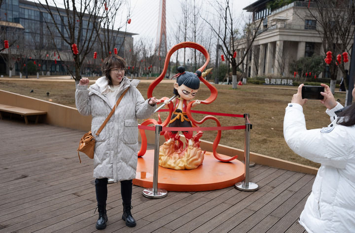 2025年2月8日,影迷在成都天府長島數字文創園哪吒形象雕塑前合影。新華社記者 江宏景 攝