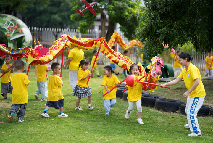 2025年9月5日,四川瀘州白酒產業園區天驕托育園的老師帶領孩子們舞龍。新華社記者 江宏景 攝