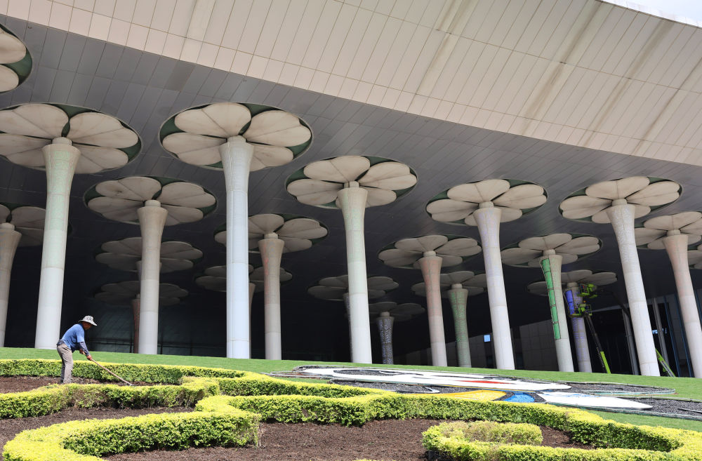 2025年10月5日,工人在國家會展中心(上海)南廣場花壇作業。新華社記者 方喆 攝