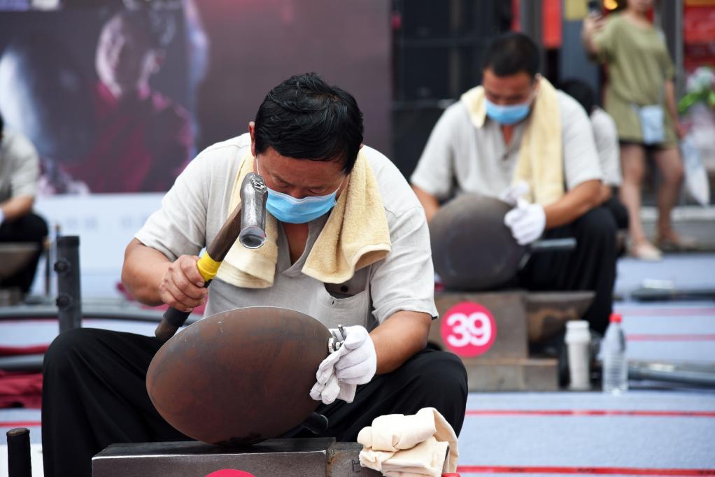 章丘打鍋工匠演示章丘鐵鍋的冷鍛技藝。新華社記者 王凱 攝