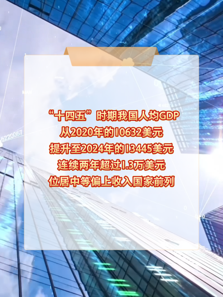 人均國內生產總值(GDP)是衡量一個國家或地區經濟發展水平和富裕程度的重要指標?!笆奈濉睍r期,我國人均GDP從2020年的10632美元提升至2024年的13445美元,連續兩年超過1.3萬美元,位居中等偏上收入國家前列。