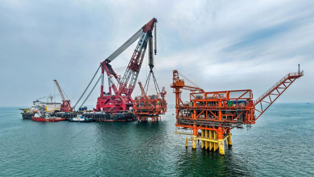 9月8日,墾利6-1油田10-1北區塊Ⅱ期開發項目油氣平臺在渤海海域完成海上安裝(無人機照片)。新華社發(杜鵬輝 攝)