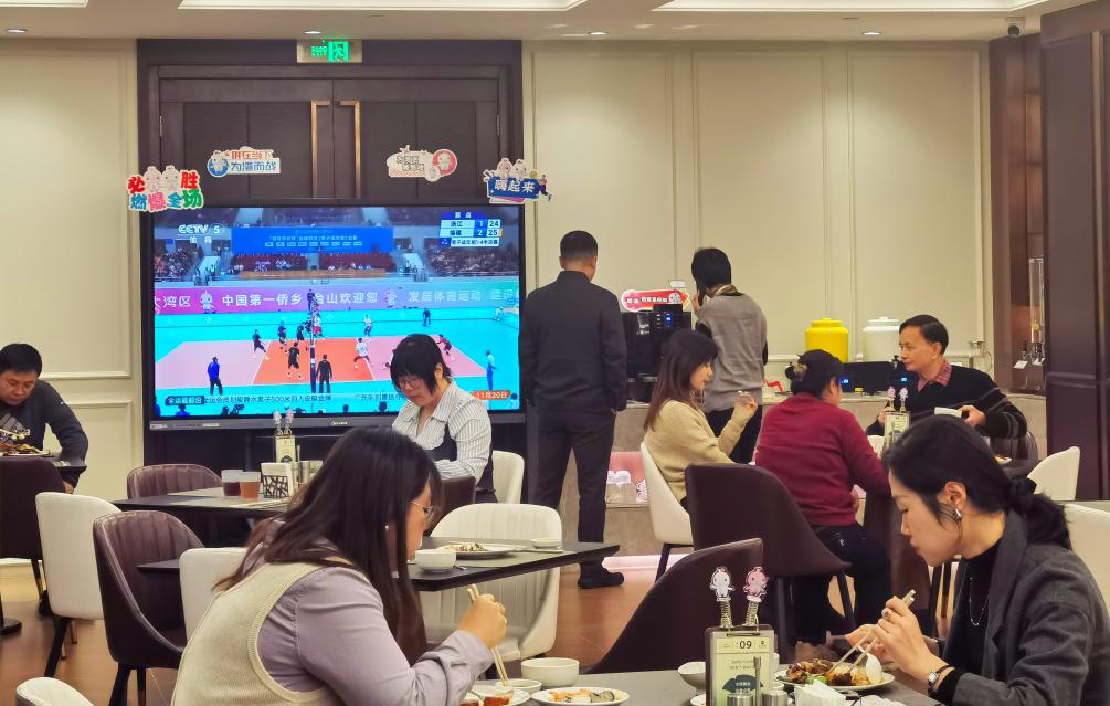 11月20日,游客在廣州一家餐廳內用餐,一旁的電視正轉播全運會比賽。新華社記者洪澤華 攝
