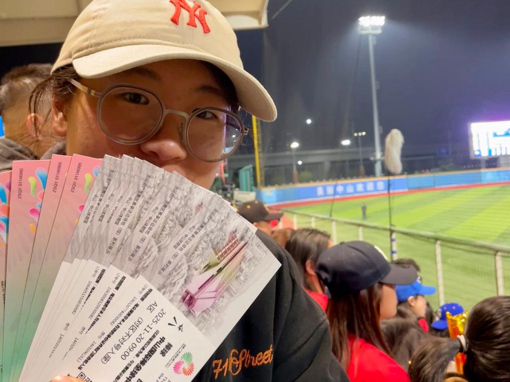 11月20日,一名觀眾在全運會棒球比賽現場展示自己的票根。新華社記者霍思穎 攝