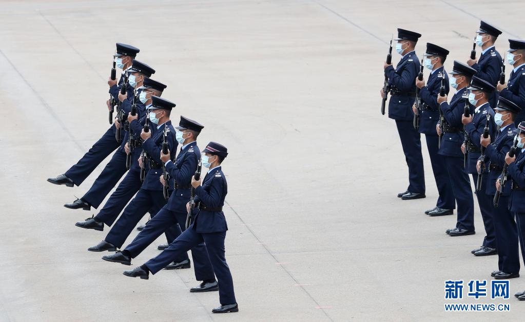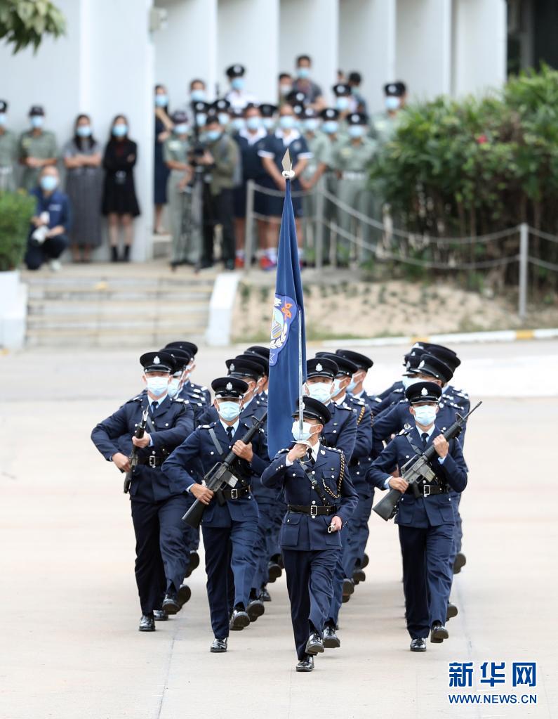 上午10時許,在香港警察學院,隨著警察樂隊奏響《歌唱祖國》,國旗方隊踢正步入場?!跋蛴铱待R”“向前看”“向國旗敬禮”,在雄渾有力的口令指揮下,國旗方隊迅速完成轉體轉身、立定靠腳等一系列動作。
