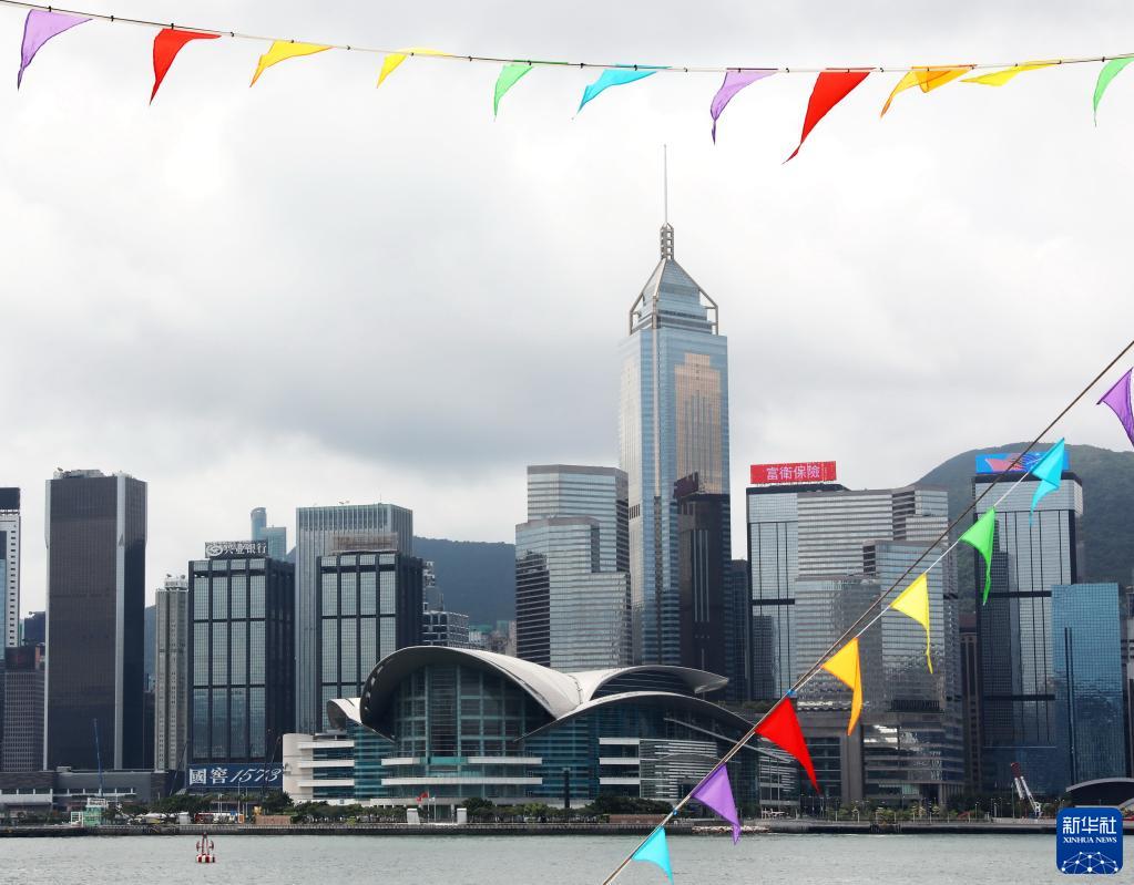 在香港尖沙咀,中華人民共和國國旗和香港特別行政區區旗一起迎風飄揚( 6月29日攝)。新華社記者 李鋼 攝