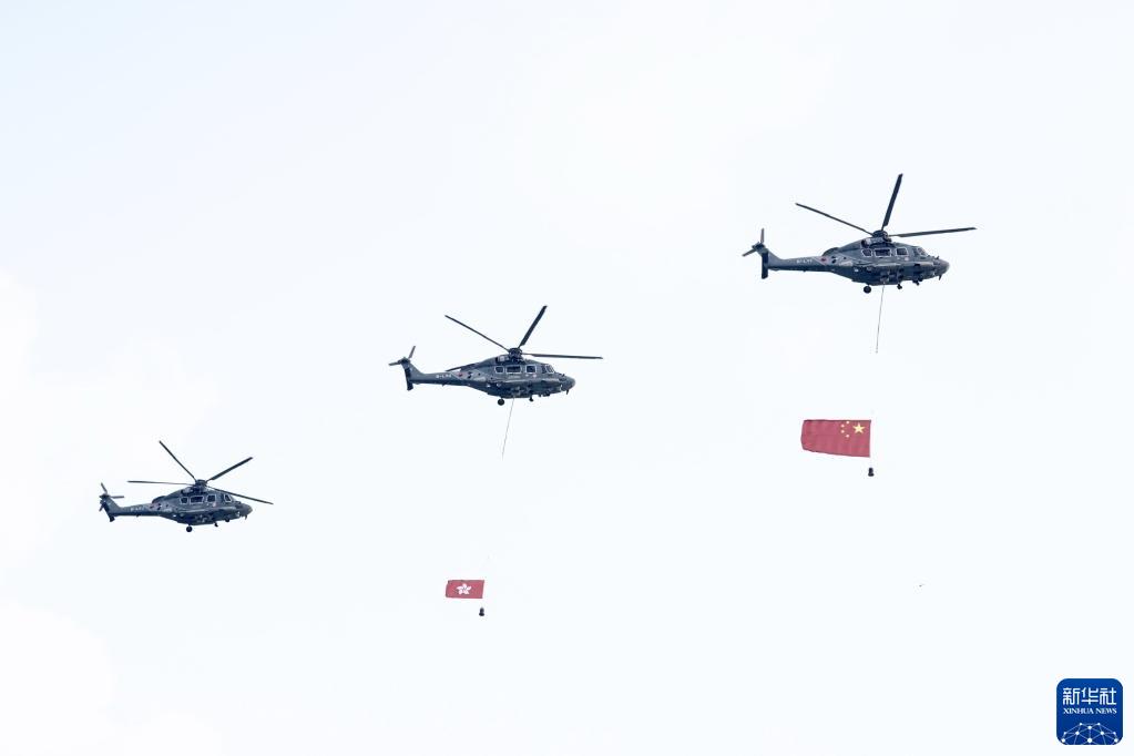 在香港警察銀樂隊的奏樂中,儀仗隊和護旗隊邁著中式步操進入廣場。懸掛著國旗和區旗的特區政府飛行服務隊直升機轟鳴著飛過維港上空,消防處滅火輪噴灑著高高的水柱從水面駛過。