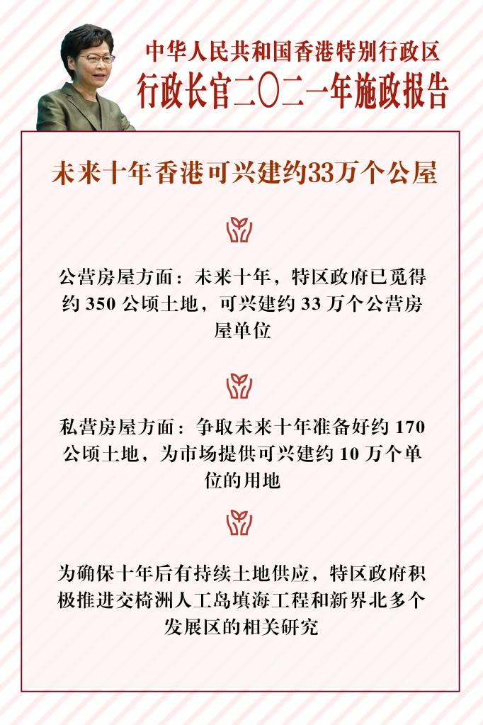 林鄭月娥指出,估計香港從2019年至2048年的土地短缺約為3000公頃。通過成功推動各項新發展區及填海項目,以及推展北部都會區,有信心會在中長期找到所欠缺的土地。