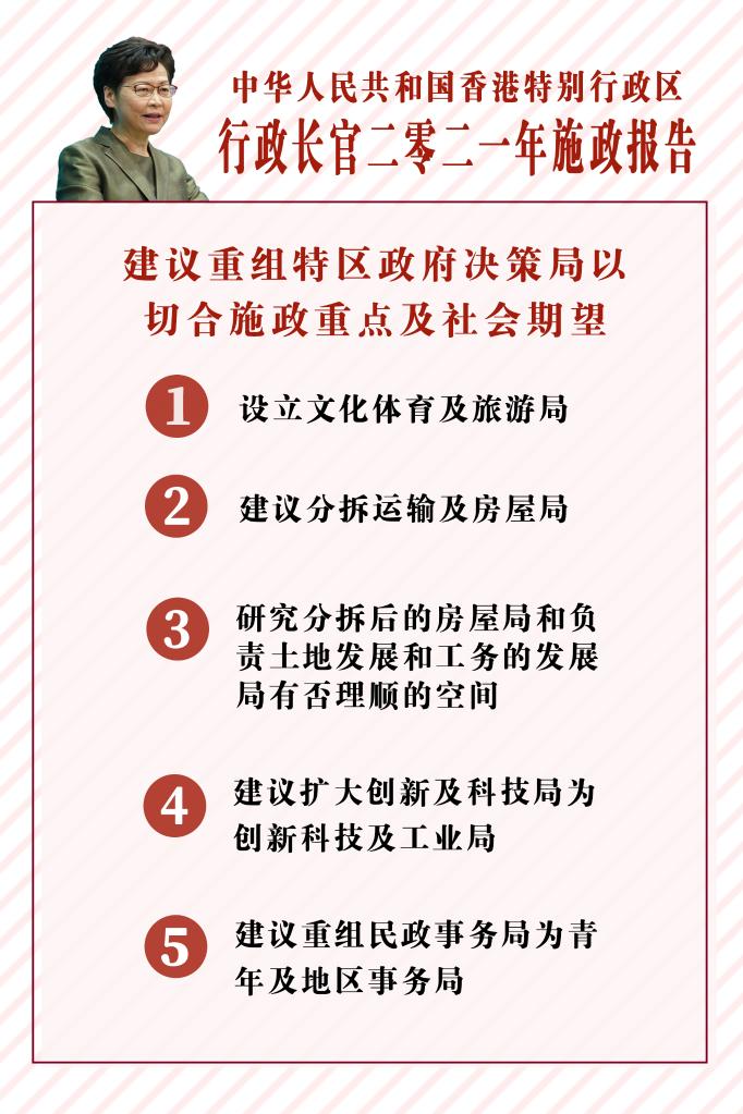 為提升管治迎接新挑戰,林鄭月娥就重組特區政府決策局提出建議。她建議重組可采納以下方向:設立文化體育及旅游局,推進香港發展成為中外文化藝術交流中心;建議分拆運輸及房屋局,讓這兩大政策范疇可獲得更專注的高層領導;建議擴大創新及科技局為創新科技及工業局,改變香港“工業式微”的觀感;建議重組民政事務局為青年及地區事務局,加強解決地區問題及支持青年發展。