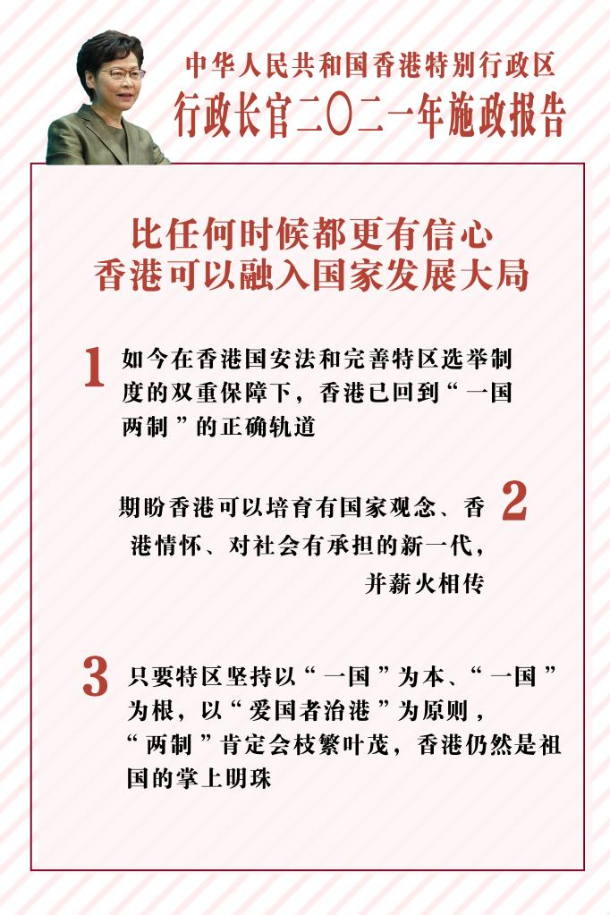 新華社香港10月6日電(記者劉明洋)香港特區行政長官林鄭月娥6日在特區立法會發表了2021年施政報告。在香港已由亂轉治的新局面下,這份長達55頁的施政報告聚焦經濟民生,回應市民關切,著眼國家戰略機遇,完善香港空間布局,積極為香港謀劃未來,力促特區全面融入國家發展大局。