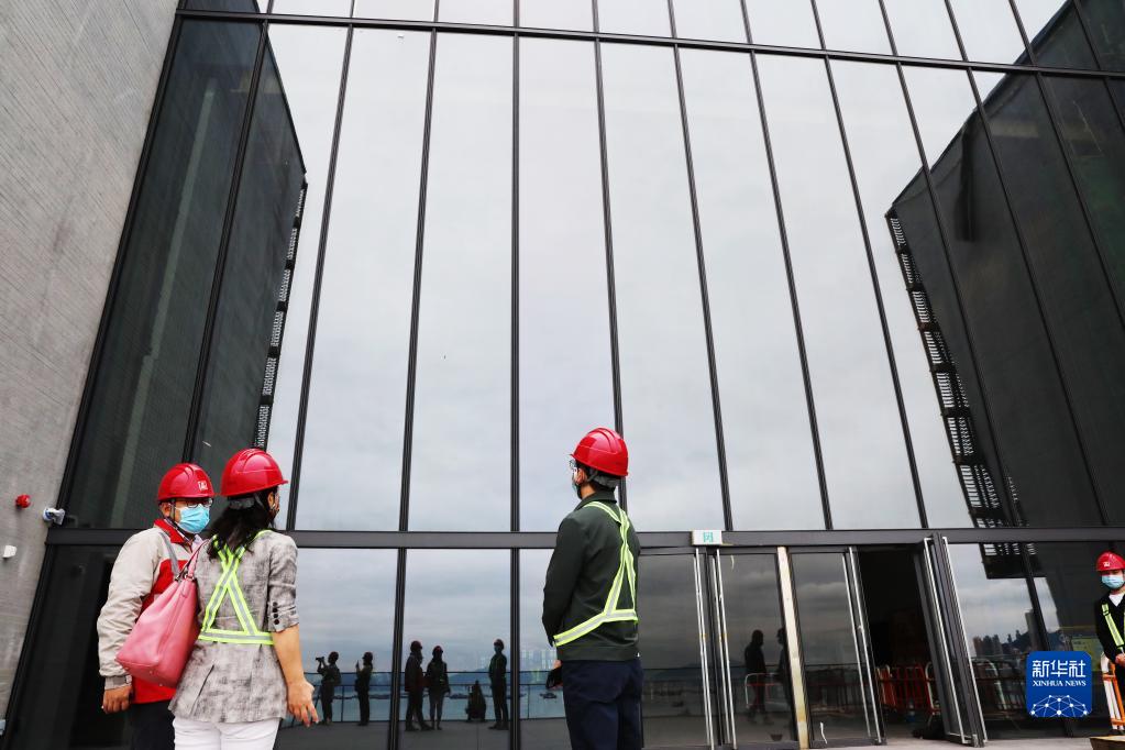 中國建筑國際集團有限公司香港故宮項目負責人王勇(左一)帶領記者參觀即將竣工的香港故宮(10月22日攝)。新華社記者 吳曉初 攝
